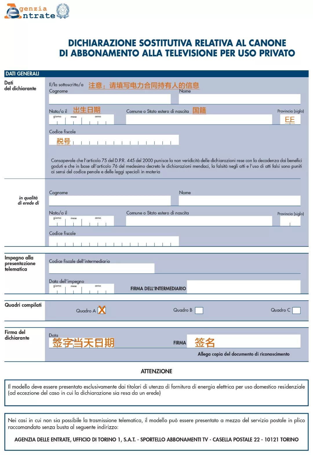 Il modulo per lesenzione del Canone Rai può essere scaricato dal sito dellAgenzia delle Entrate o per comodità potrai scaricarlo anche da qui. Accedi al modulo disdetta Canone RAI online in bolletta pdf. Casella postale 22 10121 Torino To.