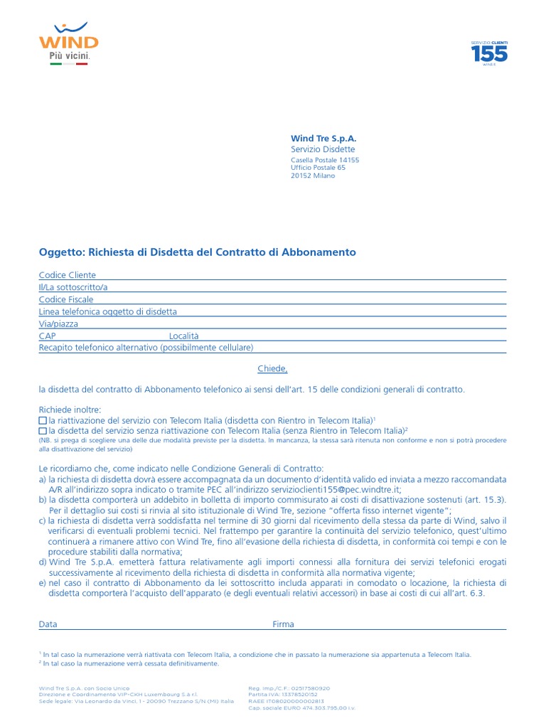 Di seguito potrete scaricare gratuitamente il Modulo disdetta Wind art70 comma 4. 25903 potrai esercitare il diritto di recesso dai servizi WINDTRE o passare a un altro operatore senza penali né costi di disattivazione entro 60 giorni dalla ricezione della specifica comunicazione inviando una richiesta con causale di. 2592003 e di recente modificato dal decreto legislativo n.