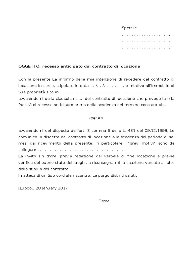 Se stai cercando un modulo PDF di disdetta anticipata dellaffitto sei Vuoi scaricare la versione compilabile dei. FAC SIMILE DI LETTERA DI DISDETTA DELLA LOCAZIONE. Con la presente dichiaro di recedere anticipatamente dal contratto di locazione in corso per limmobile sito in viapiazzan avvalendomi della clausola di cui allart.