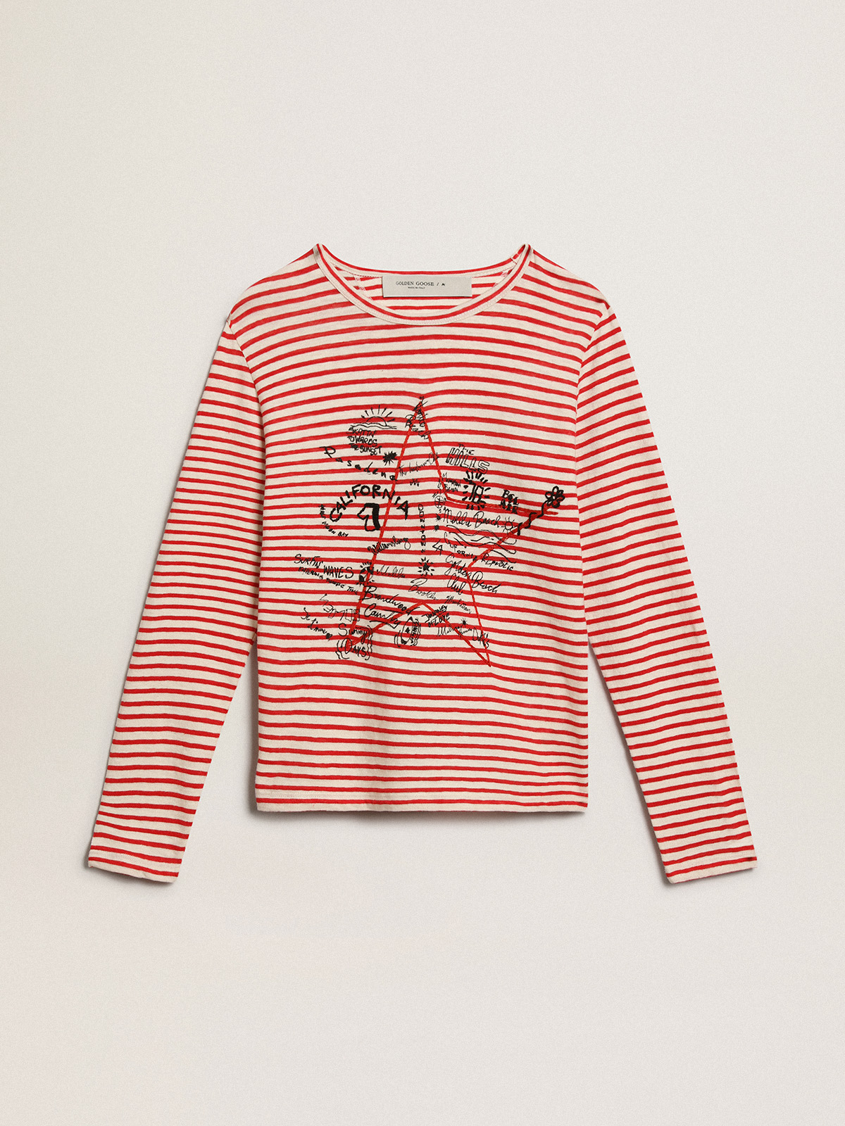 Golden Collection T Shirt With White And Red Stripes And Embroidery On The Front Golden Goose